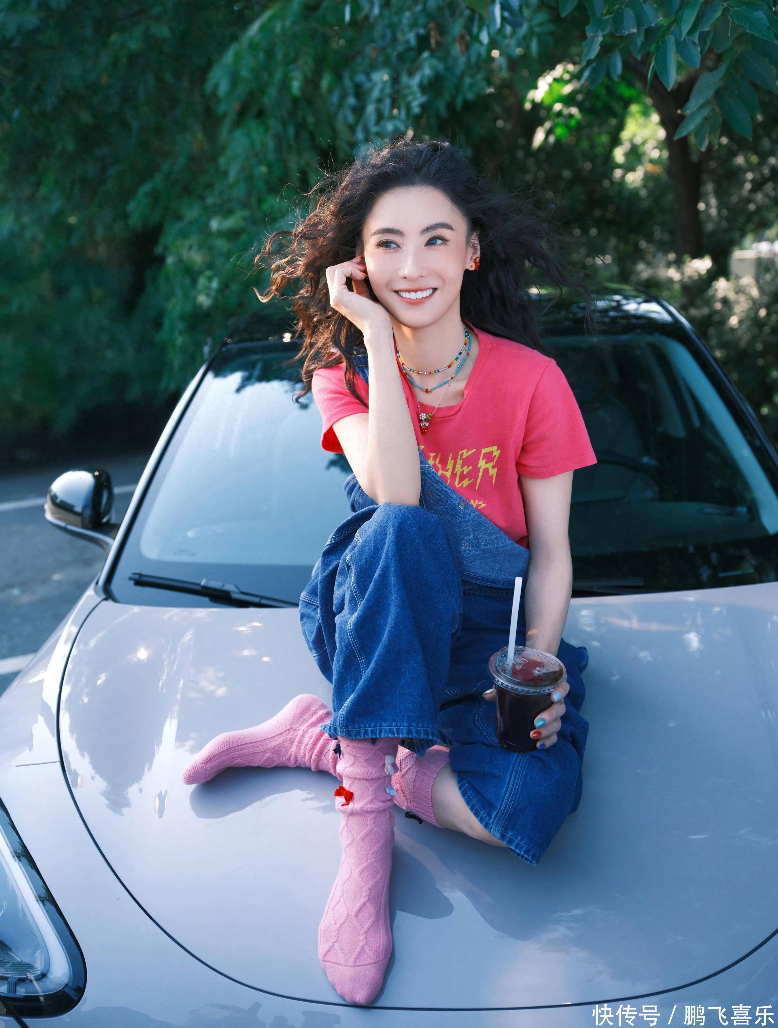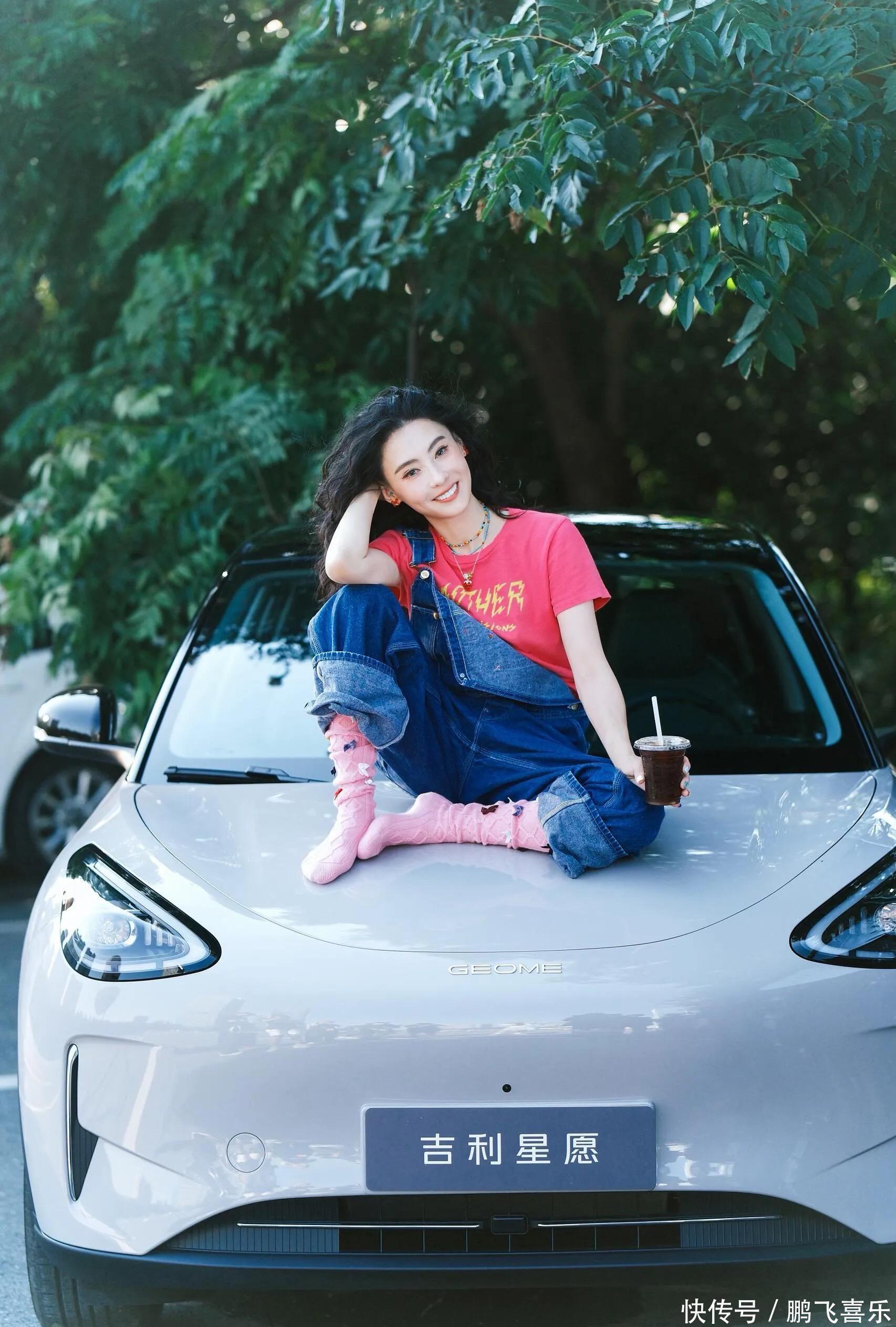 她这么一穿,完全长在年轻人的审美上了。其实吉利汽车也一直盯着年轻群体做市场,品牌里的活力、甜美、青春劲儿,都跟这些特质融合得特别好。广告里张柏芝还在车顶摆了好几个拍照姿势,比如懒洋洋坐着,一只手拿着咖啡,另一只手撑着身体,透着股惬意的美感;换个动作也超有大片感,抬头微笑着看旁边,一只手拿着咖啡杯,另一只手搂着脚踝,又俏皮又灵动,跟小姑娘似的。